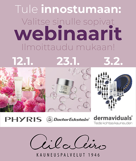 Perjantaina 23.1. tutustumme Beautiful Aging -konseptiin. Käymme läpi ikääntymisen tuomia muutoksia ihossa ja miten voimme hoitaa ja ennaltaehkäistä niitä - erityisesti Doctor Eckstein -hoitosarjan tuotteilla. Ilmoittaudu mukaan: puhelimitse 09 505 1234 tai sähköpostitse info@ailaairo.fi.